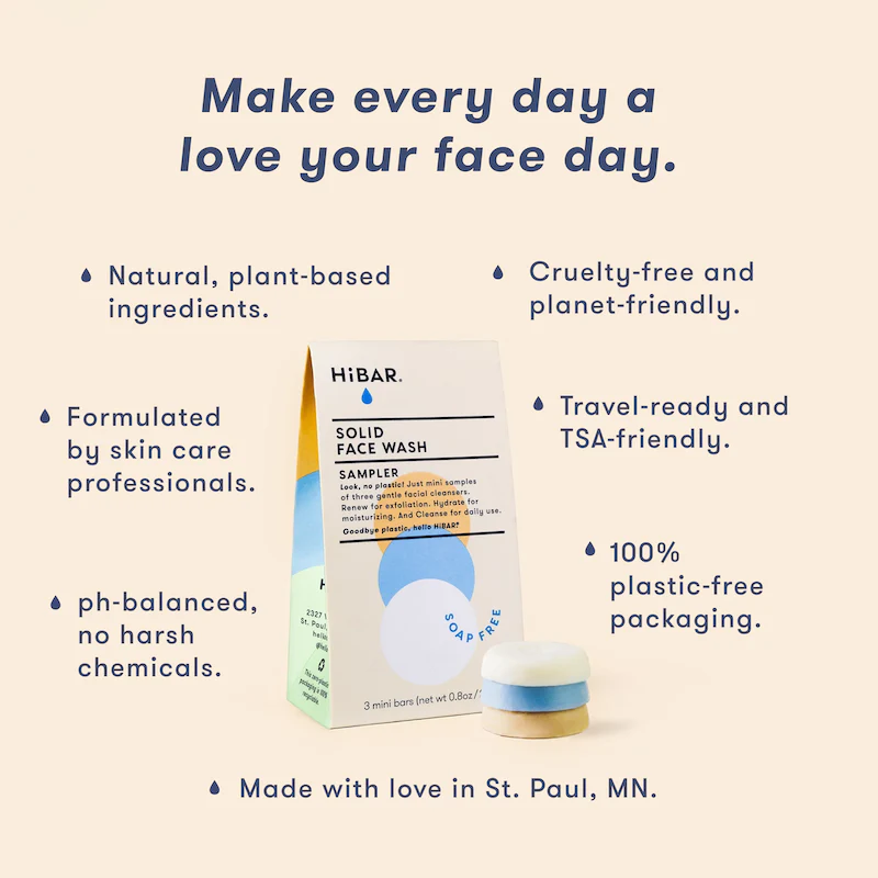 Meet HiBAR’s sample size, soap-free, certified vegan face wash bars—the first solid amino acid facial cleansing bars with formulas tailored for specific skin types. But how to know which HiBAR face wash is best for you? That’s where our solid facial bar sampler pack comes into play. Each set includes a miniature bar of each of our formulas, so you can try them all.