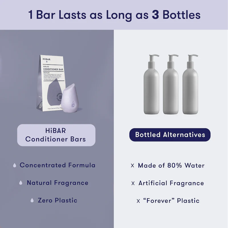 The unique shape of HiBAR Shampoo Bars and Conditioner Bars are designed to fit comfortably in your hand for easy use. And don’t be fooled by the compact size—each conditioner bar lasts as long as 3 big bottles of liquid conditioner.